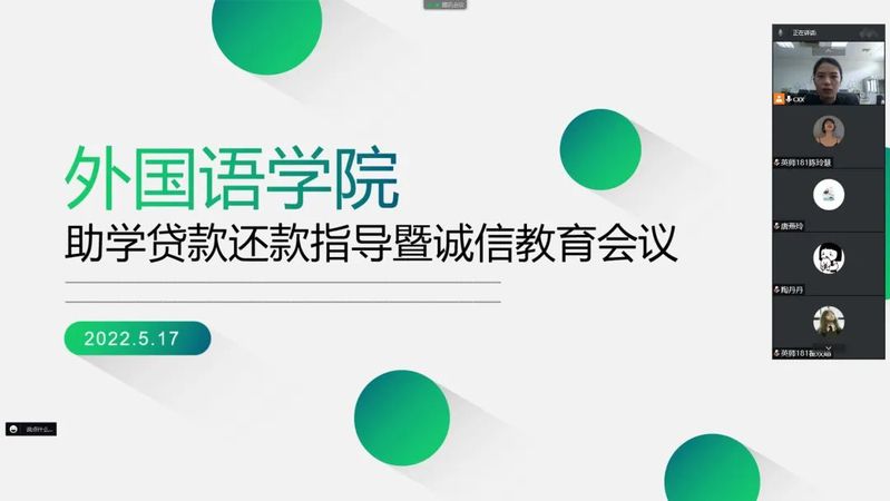 5月17日,304永利召开助学贷款还款指导暨诚信教育线上会议,公司党委副书记、副经理陈俊怀,学工办主任王媛媛出席会议,学院对接员工资助工作辅导员陈习主持会议,2022届全体贷款毕业生参会。