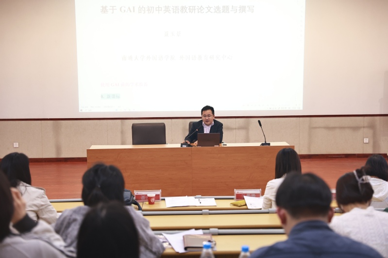 本次活动以“聚焦学科素养,构建英语教学新样态”为主题,吸引了工作坊全体成员、英语学科基地校青年教师以及朝前路实验学校中学部英语组教师参与。聂玉景博士作为特邀专家,为与会教师带来了《基于GAI的初中英语教研论文选题与撰写》的专题讲座。